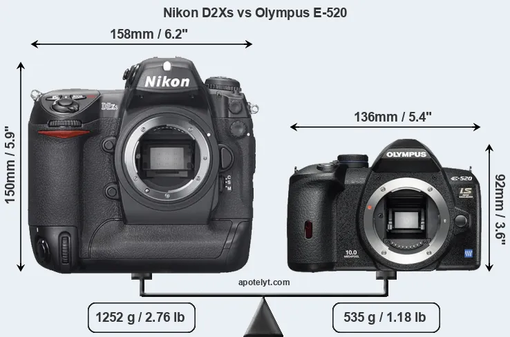 The physical size and weight of the Nikon D2Xs and the Olympus E-520 are illustrated in the side-by-side display below. The two cameras are presented according to their relative size. Three successive views from the front, the top, and the rear are shown. All width, height and depth dimensions are rounded to the nearest millimeter.