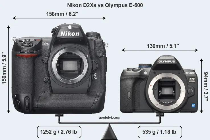 The side-by-side display below illustrates the physical size and weight of the Nikon D2Xs and the Olympus E-600. The two cameras are presented according to their relative size. Three consecutive views from the front, the top, and the rear side are shown. All width, height and depth dimensions are rounded to the nearest millimeter.