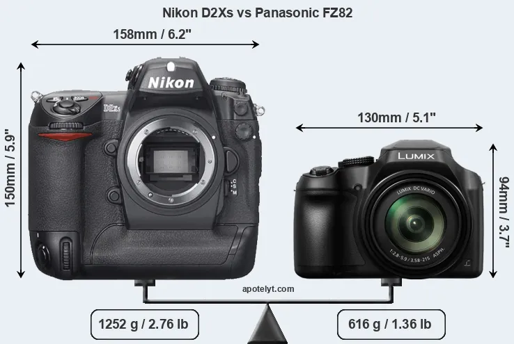 An illustration of the physical size and weight of the Nikon D2Xs and the Panasonic FZ82 is provided in the side-by-side display below. The two cameras are presented according to their relative size. Three successive views from the front, the top, and the rear are shown. All width, height and depth dimensions are rounded to the nearest millimeter.