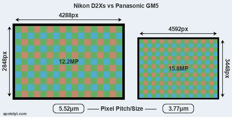 Despite having a smaller sensor, the GM5 offers a higher resolution of 15.8 megapixels, compared with 12.2 MP of the D2Xs. This megapixels advantage comes at the cost of a higher pixel density and a smaller size of the individual pixel (with a pixel pitch of 3.77μm versus 5.52μm for the D2Xs). However, it should be noted that the GM5 is much more recent (by 8 years and 3 months) than the D2Xs, and its sensor will have benefitted from technological advances during this time that make it possible to gather light more efficiently.
