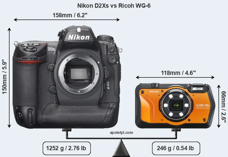 An illustration of the physical size and weight of the Nikon D2Xs and the Ricoh WG-6 is provided in the side-by-side display below. The two cameras are presented according to their relative size. Three consecutive views from the front, the top, and the rear side are shown. All width, height and depth dimensions are rounded to the nearest millimeter.