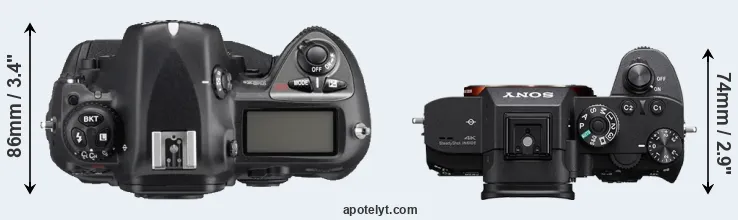 The side-by-side display below illustrates the physical size and weight of the Nikon D2Xs and the Sony A7R III. The two cameras are presented according to their relative size. Three successive views from the front, the top, and the rear are shown. All width, height and depth measures are rounded to the nearest millimeter.