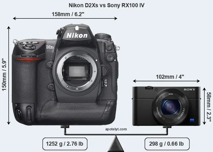 The side-by-side display below illustrates the physical size and weight of the Nikon D2Xs and the Sony RX100 IV. The two cameras are presented according to their relative size. Three consecutive views from the front, the top, and the rear side are shown. All width, height and depth dimensions are rounded to the nearest millimeter.