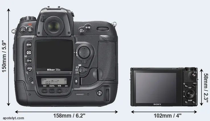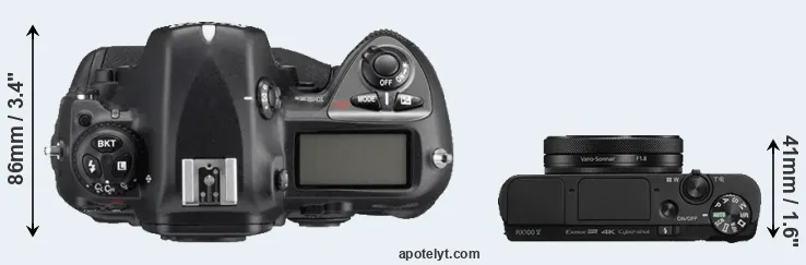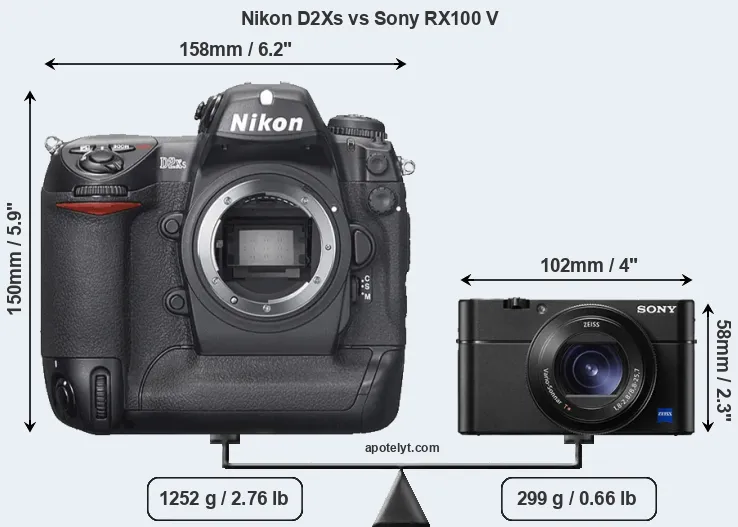 The side-by-side display below illustrates the physical size and weight of the Nikon D2Xs and the Sony RX100 V. The two cameras are presented according to their relative size. Three consecutive views from the front, the top, and the rear side are shown. All width, height and depth dimensions are rounded to the nearest millimeter.