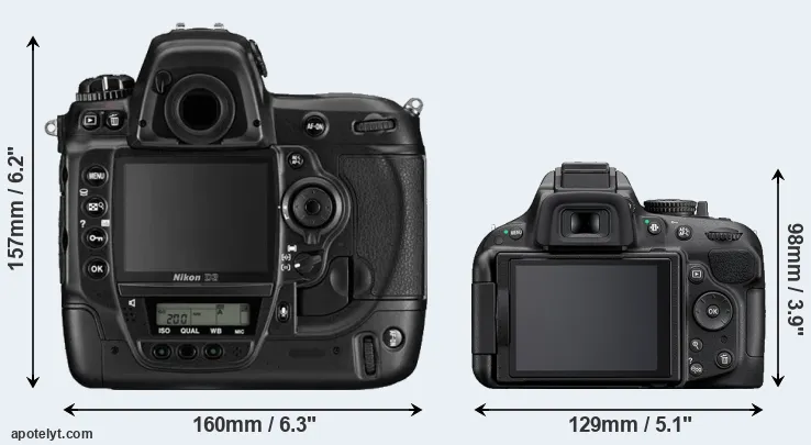 The physical size and weight of the Nikon D3 and the Nikon D5200 are illustrated in the side-by-side display below. The two cameras are presented according to their relative size. Three consecutive perspectives from the front, the top, and the back are available. All width, height and depth dimensions are rounded to the nearest millimeter.