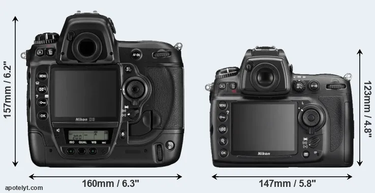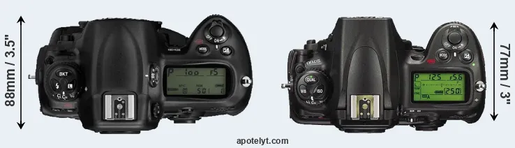The side-by-side display below illustrates the physical size and weight of the Nikon D3 and the Nikon D700. The two cameras are presented according to their relative size. Three consecutive views from the front, the top, and the rear side are shown. All width, height and depth dimensions are rounded to the nearest millimeter.