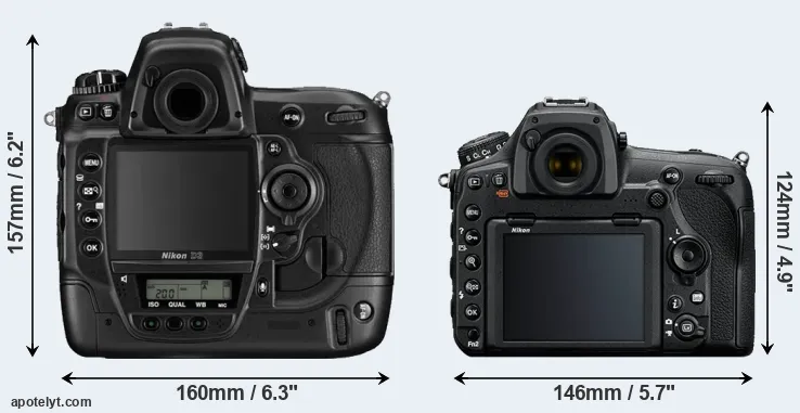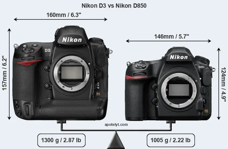 The side-by-side display below illustrates the physical size and weight of the Nikon D3 and the Nikon D850. The two cameras are presented according to their relative size. Three consecutive views from the front, the top, and the rear side are shown. All width, height and depth dimensions are rounded to the nearest millimeter.