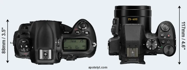 The physical size and weight of the Nikon D3 and the Panasonic FZ330 are illustrated in the side-by-side display below. The two cameras are presented according to their relative size. Three consecutive perspectives from the front, the top, and the back are available. All width, height and depth measures are rounded to the nearest millimeter.
