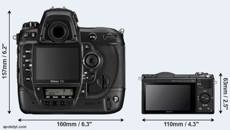 The side-by-side display below illustrates the physical size and weight of the Nikon D3 and the Sony A5000. The two cameras are presented according to their relative size. Three consecutive views from the front, the top, and the rear side are shown. All width, height and depth measures are rounded to the nearest millimeter.