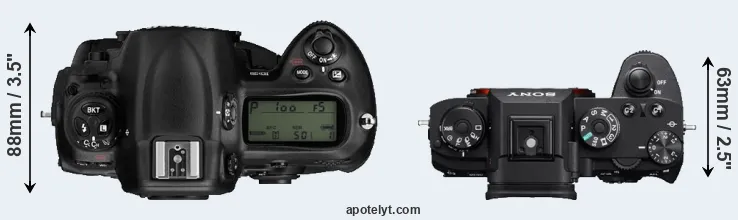 The physical size and weight of the Nikon D3 and the Sony A9 are illustrated in the side-by-side display below. The two cameras are presented according to their relative size. Three consecutive views from the front, the top, and the rear side are shown. All width, height and depth dimensions are rounded to the nearest millimeter.