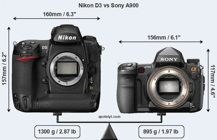 The side-by-side display below illustrates the physical size and weight of the Nikon D3 and the Sony A900. The two cameras are presented according to their relative size. Three successive views from the front, the top, and the rear are shown. All width, height and depth dimensions are rounded to the nearest millimeter.