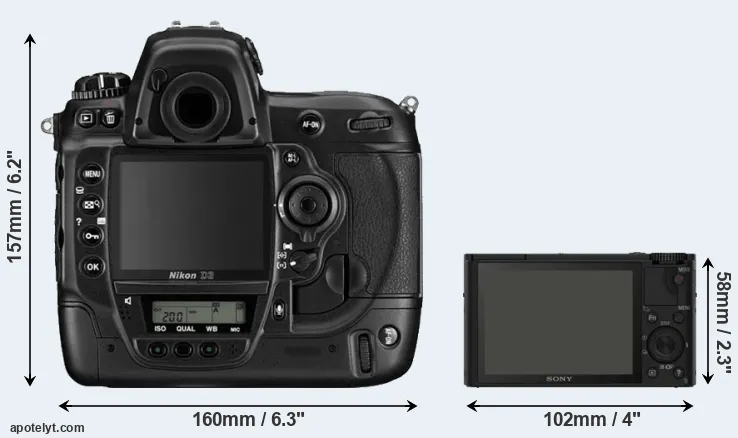 An illustration of the physical size and weight of the Nikon D3 and the Sony RX100 is provided in the side-by-side display below. The two cameras are presented according to their relative size. Three consecutive perspectives from the front, the top, and the back are available. All size dimensions are rounded to the nearest millimeter.