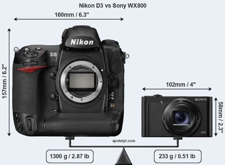 An illustration of the physical size and weight of the Nikon D3 and the Sony WX800 is provided in the side-by-side display below. The two cameras are presented according to their relative size. Three successive views from the front, the top, and the rear are shown. All width, height and depth dimensions are rounded to the nearest millimeter.