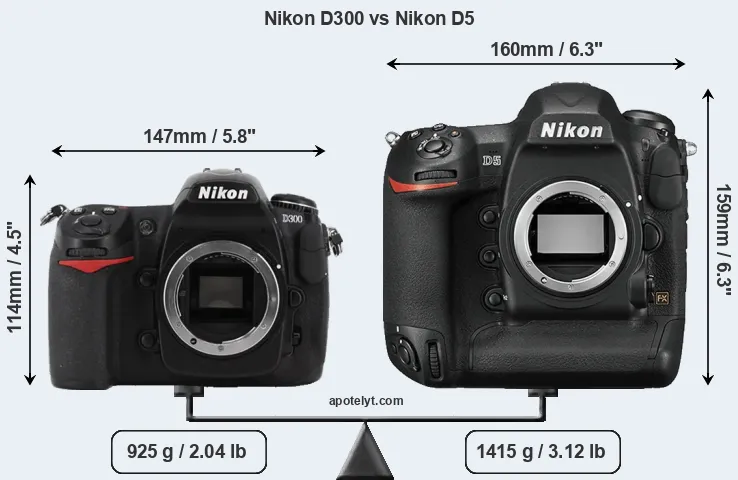 The physical size and weight of the Nikon D300 and the Nikon D5 are illustrated in the side-by-side display below. The two cameras are presented according to their relative size. Three consecutive perspectives from the front, the top, and the back are available. All width, height and depth dimensions are rounded to the nearest millimeter.