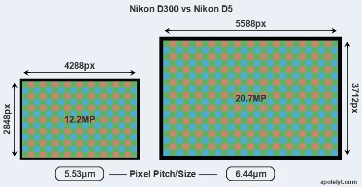 With 20.7MP, the D5 offers a higher resolution than the D300 (12.2MP), but the D5 nevertheless has larger individual pixels (pixel pitch of 6.44μm versus 5.53μm for the D300) due to its larger sensor. Moreover, the D5 is a much more recent model (by 8 years and 4 months) than the D300, and its sensor will have benefitted from technological advances during this time that further enhance the light gathering capacity of its pixel-units.