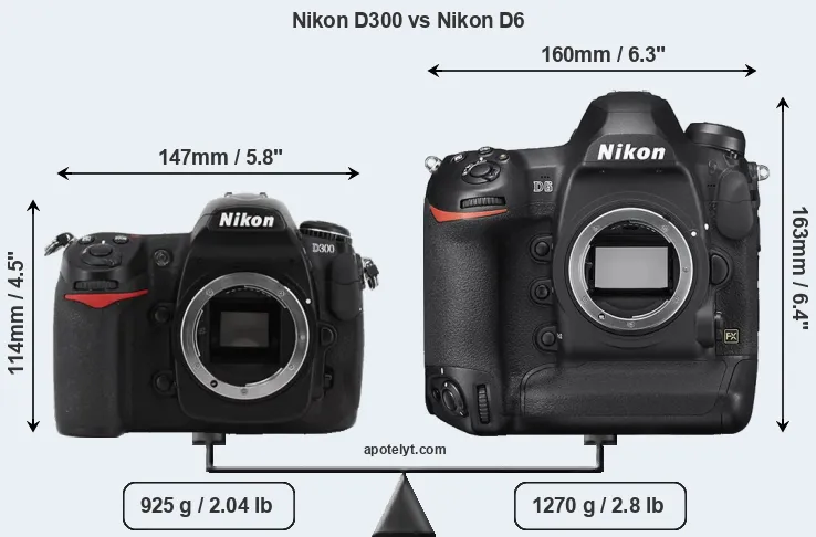 An illustration of the physical size and weight of the Nikon D300 and the Nikon D6 is provided in the side-by-side display below. The two cameras are presented according to their relative size. Three consecutive perspectives from the front, the top, and the back are available. All width, height and depth measures are rounded to the nearest millimeter.