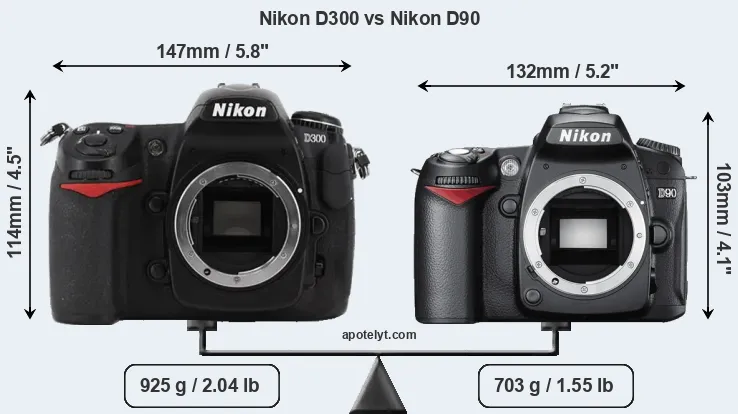 The physical size and weight of the Nikon D300 and the Nikon D90 are illustrated in the side-by-side display below. The two cameras are presented according to their relative size. Three successive views from the front, the top, and the rear are shown. All width, height and depth measures are rounded to the nearest millimeter.
