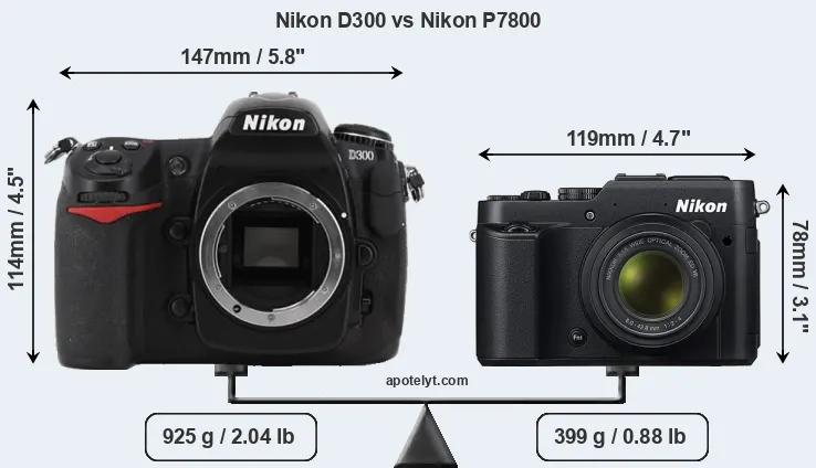 The physical size and weight of the Nikon D300 and the Nikon P7800 are illustrated in the side-by-side display below. The two cameras are presented according to their relative size. Three consecutive views from the front, the top, and the rear side are shown. All width, height and depth measures are rounded to the nearest millimeter.