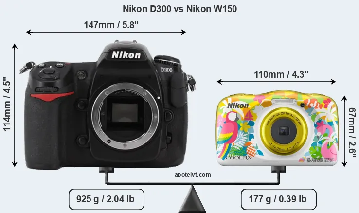 The physical size and weight of the Nikon D300 and the Nikon W150 are illustrated in the side-by-side display below. The two cameras are presented according to their relative size. Three successive views from the front, the top, and the rear are shown. All width, height and depth measures are rounded to the nearest millimeter.