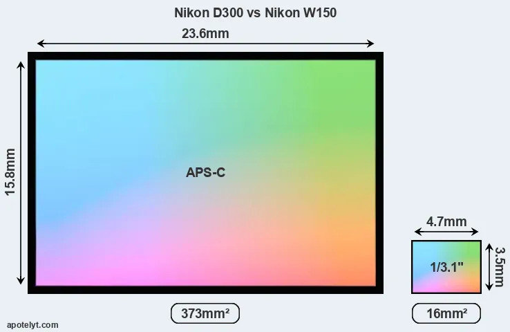 Of the two cameras under consideration, the Nikon D300 features an APS-C sensor and the Nikon W150 a 1/3.1-inch sensor. The sensor area in the W150 is 96 percent smaller. As a result of these sensor size differences, the cameras have a format factor of, respectively, 1.5 and 7.4. The sensor in the D300 has a native 3:2 aspect ratio, while the one in the W150 offers a 4:3 aspect.