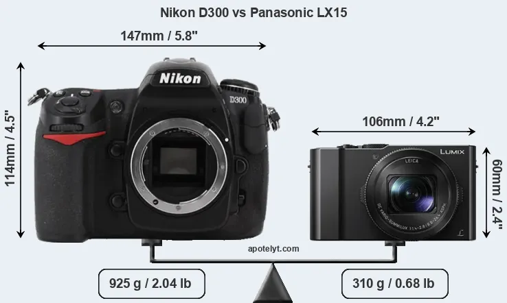 An illustration of the physical size and weight of the Nikon D300 and the Panasonic LX15 is provided in the side-by-side display below. The two cameras are presented according to their relative size. Three successive views from the front, the top, and the rear are shown. All width, height and depth dimensions are rounded to the nearest millimeter.