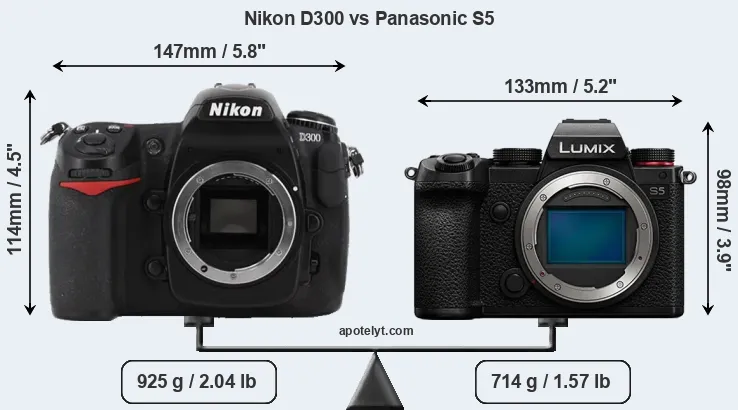 The side-by-side display below illustrates the physical size and weight of the Nikon D300 and the Panasonic S5. The two cameras are presented according to their relative size. Three consecutive perspectives from the front, the top, and the back are available. All width, height and depth measures are rounded to the nearest millimeter.