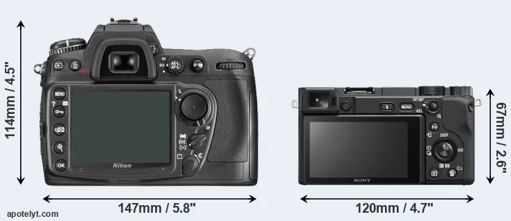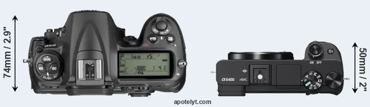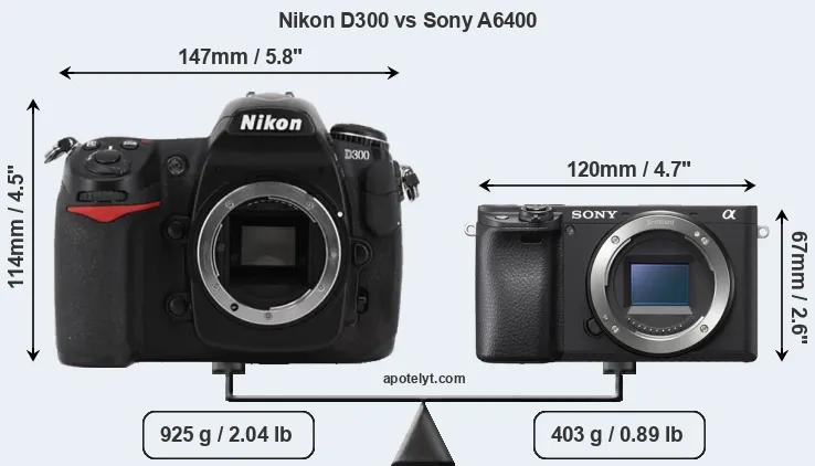 The side-by-side display below illustrates the physical size and weight of the Nikon D300 and the Sony A6400. The two cameras are presented according to their relative size. Three consecutive perspectives from the front, the top, and the back are available. All width, height and depth measures are rounded to the nearest millimeter.