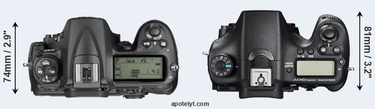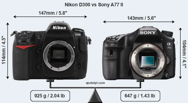 The side-by-side display below illustrates the physical size and weight of the Nikon D300 and the Sony A77 II. The two cameras are presented according to their relative size. Three consecutive views from the front, the top, and the rear side are shown. All width, height and depth dimensions are rounded to the nearest millimeter.