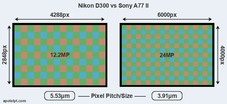 Despite having a slightly smaller sensor, the A77 II offers a higher resolution of 24 megapixels, compared with 12.2 MP of the D300. This megapixels advantage comes at the cost of a higher pixel density and a smaller size of the individual pixel (with a pixel pitch of 3.91μm versus 5.53μm for the D300). However, it should be noted that the A77 II is much more recent (by 6 years and 8 months) than the D300, and its sensor will have benefitted from technological advances during this time that make it possible to gather light more efficiently.