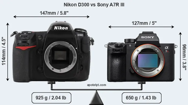 The physical size and weight of the Nikon D300 and the Sony A7R III are illustrated in the side-by-side display below. The two cameras are presented according to their relative size. Three successive views from the front, the top, and the rear are shown. All size dimensions are rounded to the nearest millimeter.