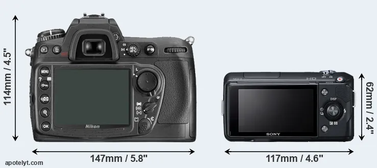 The side-by-side display below illustrates the physical size and weight of the Nikon D300 and the Sony NEX-3. The two cameras are presented according to their relative size. Three consecutive views from the front, the top, and the rear side are shown. All width, height and depth dimensions are rounded to the nearest millimeter.