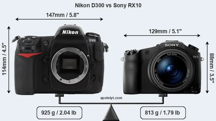 An illustration of the physical size and weight of the Nikon D300 and the Sony RX10 is provided in the side-by-side display below. The two cameras are presented according to their relative size. Three consecutive perspectives from the front, the top, and the back are available. All size dimensions are rounded to the nearest millimeter.