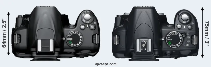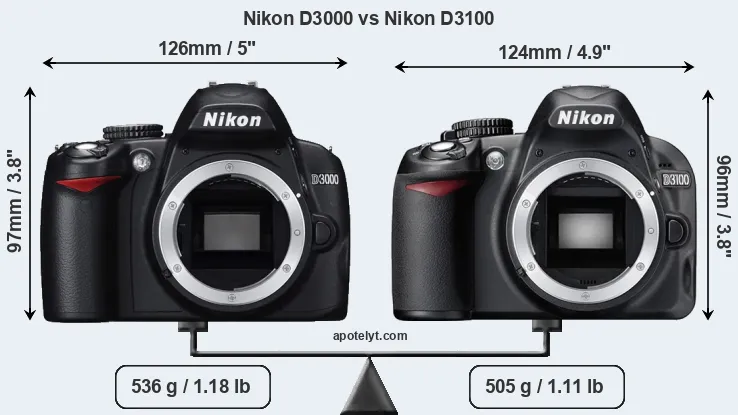 The physical size and weight of the Nikon D3000 and the Nikon D3100 are illustrated in the side-by-side display below. The two cameras are presented according to their relative size. Three consecutive views from the front, the top, and the rear side are shown. All width, height and depth measures are rounded to the nearest millimeter.