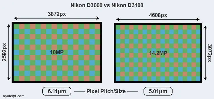Despite having a smaller sensor, the D3100 offers a higher resolution of 14.2 megapixels, compared with 10 MP of the D3000. This megapixels advantage comes at the cost of a higher pixel density and a smaller size of the individual pixel (with a pixel pitch of 5.01μm versus 6.11μm for the D3000). However, it should be noted that the D3100 is a somewhat more recent model (by 1 year) than the D3000, and its sensor might have benefitted from technological advances during this time that partly offset its pixel-size disadvantage.