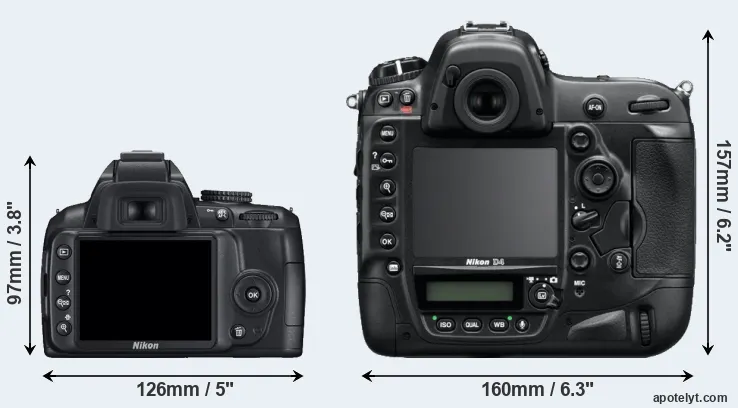 The physical size and weight of the Nikon D3000 and the Nikon D4 are illustrated in the side-by-side display below. The two cameras are presented according to their relative size. Three consecutive perspectives from the front, the top, and the back are available. All size dimensions are rounded to the nearest millimeter.