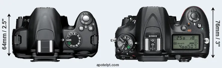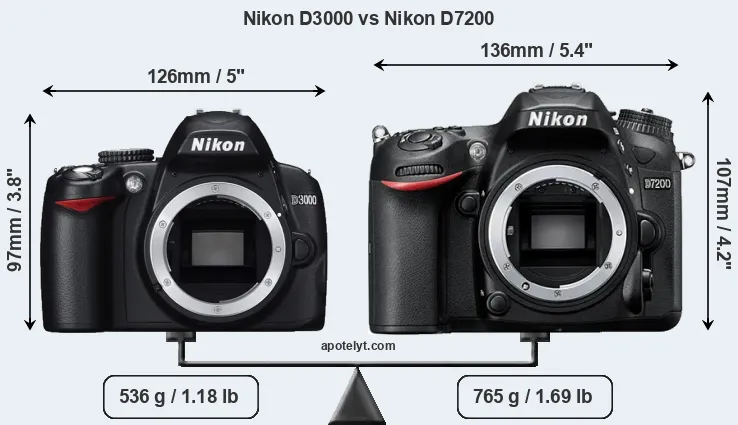 The physical size and weight of the Nikon D3000 and the Nikon D7200 are illustrated in the side-by-side display below. The two cameras are presented according to their relative size. Three successive views from the front, the top, and the rear are shown. All width, height and depth dimensions are rounded to the nearest millimeter.