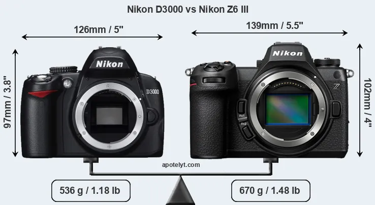 The physical size and weight of the Nikon D3000 and the Nikon Z6 III are illustrated in the side-by-side display below. The two cameras are presented according to their relative size. Three successive views from the front, the top, and the rear are shown. All width, height and depth measures are rounded to the nearest millimeter.