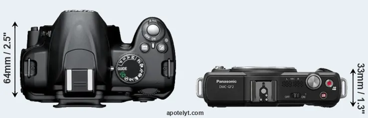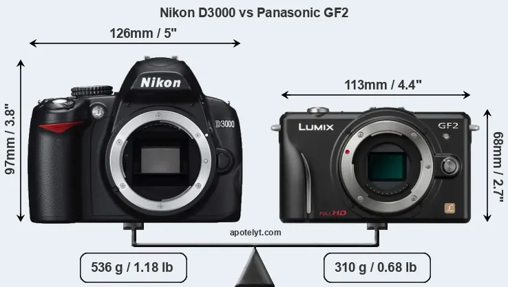 An illustration of the physical size and weight of the Nikon D3000 and the Panasonic GF2 is provided in the side-by-side display below. The two cameras are presented according to their relative size. Three successive views from the front, the top, and the rear are shown. All width, height and depth dimensions are rounded to the nearest millimeter.