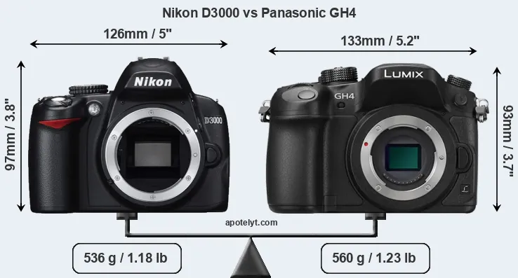 If the front view area (width x height) of the cameras is taken as an aggregate measure of their size, the Panasonic GH4 is somewhat larger (1 percent) than the Nikon D3000. Moreover, the GH4 is slightly heavier (4 percent) than the D3000. It is noteworthy in this context that the GH4 is splash and dust-proof, while the D3000 does not feature any corresponding weather-sealing.
