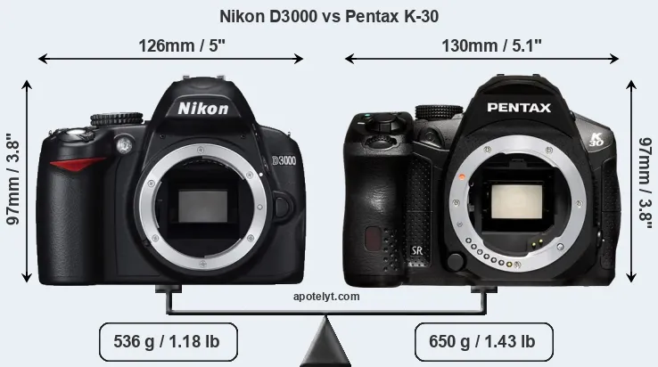 If the front view area (width x height) of the cameras is taken as an aggregate measure of their size, the Pentax K-30 is somewhat larger (3 percent) than the Nikon D3000. Moreover, the K-30 is markedly heavier (21 percent) than the D3000. It is noteworthy in this context that the K-30 is splash and dust-proof, while the D3000 does not feature any corresponding weather-sealing.