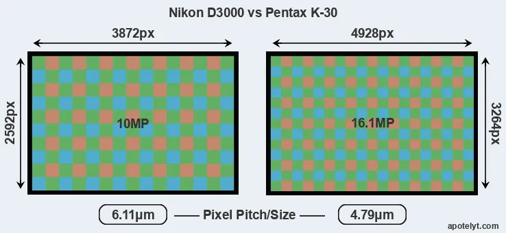 Despite having a slightly smaller sensor, the K-30 offers a higher resolution of 16.1 megapixels, compared with 10 MP of the D3000. This megapixels advantage comes at the cost of a higher pixel density and a smaller size of the individual pixel (with a pixel pitch of 4.79μm versus 6.11μm for the D3000). However, it should be noted that the K-30 is much more recent (by 2 years and 9 months) than the D3000, and its sensor will have benefitted from technological advances during this time that make it possible to gather light more efficiently.