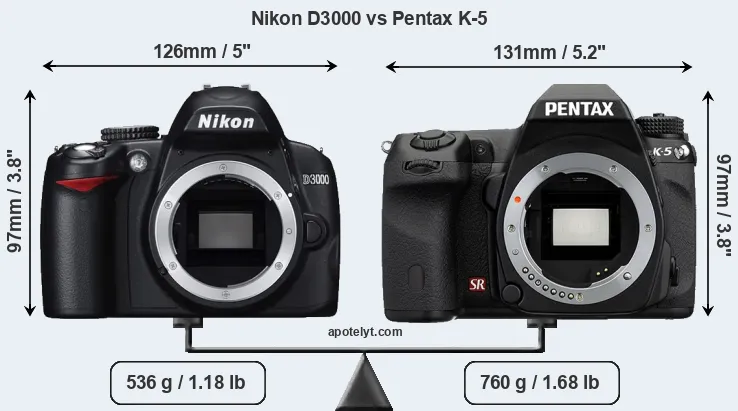 If the front view area (width x height) of the cameras is taken as an aggregate measure of their size, the Pentax K-5 is somewhat larger (4 percent) than the Nikon D3000. Moreover, the K-5 is substantially heavier (42 percent) than the D3000. It is noteworthy in this context that the K-5 is splash and dust-proof, while the D3000 does not feature any corresponding weather-sealing.