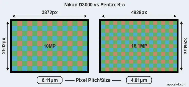 Despite having a slightly smaller sensor, the K-5 offers a higher resolution of 16.1 megapixels, compared with 10 MP of the D3000. This megapixels advantage comes at the cost of a higher pixel density and a smaller size of the individual pixel (with a pixel pitch of 4.81μm versus 6.11μm for the D3000). However, it should be noted that the K-5 is a somewhat more recent model (by 1 year and 1 month) than the D3000, and its sensor might have benefitted from technological advances during this time that partly offset its pixel-size disadvantage.