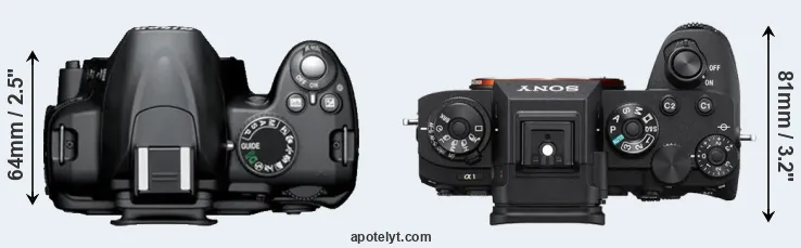 If the front view area (width x height) of the cameras is taken as an aggregate measure of their size, the Sony A1 is somewhat larger (2 percent) than the Nikon D3000. Moreover, the A1 is substantially heavier (38 percent) than the D3000. It is noteworthy in this context that the A1 is splash and dust-proof, while the D3000 does not feature any corresponding weather-sealing.