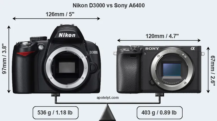 If the front view area (width x height) of the cameras is taken as an aggregate measure of their size, the Sony A6400 is considerably smaller (34 percent) than the Nikon D3000. Moreover, the A6400 is markedly lighter (25 percent) than the D3000. It is noteworthy in this context that the A6400 is splash and dust-proof, while the D3000 does not feature any corresponding weather-sealing.