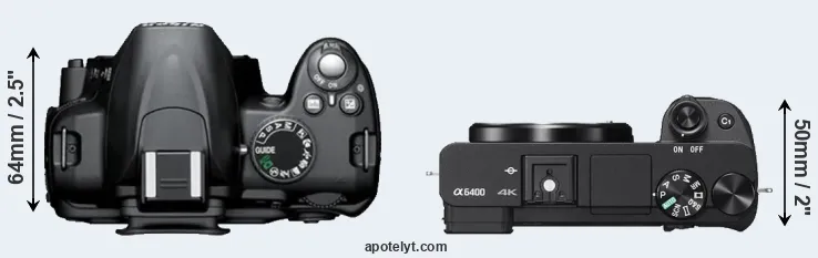The side-by-side display below illustrates the physical size and weight of the Nikon D3000 and the Sony A6400. The two cameras are presented according to their relative size. Three successive views from the front, the top, and the rear are shown. All size dimensions are rounded to the nearest millimeter.