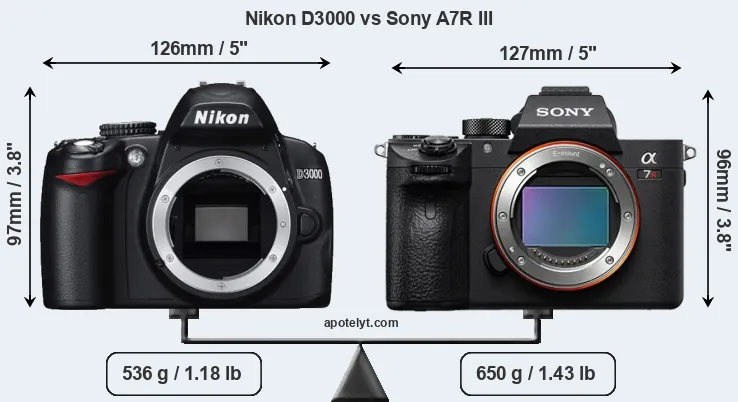 An illustration of the physical size and weight of the Nikon D3000 and the Sony A7R III is provided in the side-by-side display below. The two cameras are presented according to their relative size. Three successive views from the front, the top, and the rear are shown. All width, height and depth dimensions are rounded to the nearest millimeter.