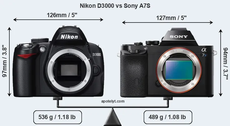 An illustration of the physical size and weight of the Nikon D3000 and the Sony A7S is provided in the side-by-side display below. The two cameras are presented according to their relative size. Three consecutive views from the front, the top, and the rear side are shown. All width, height and depth measures are rounded to the nearest millimeter.