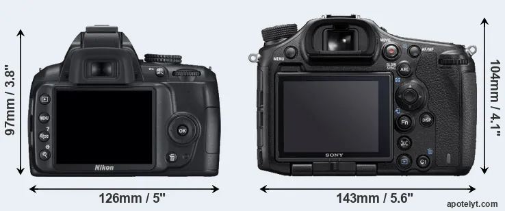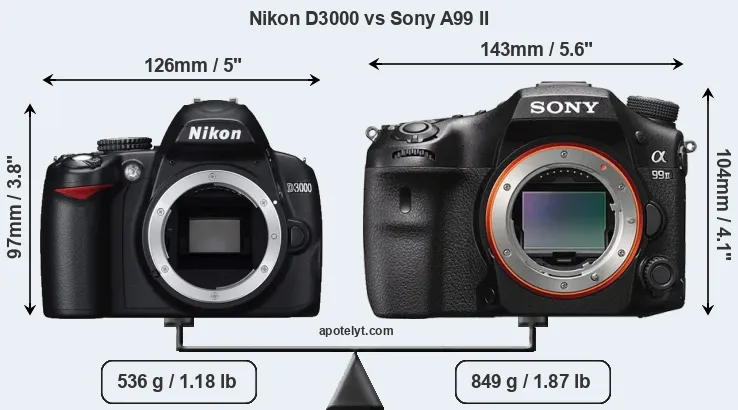 The side-by-side display below illustrates the physical size and weight of the Nikon D3000 and the Sony A99 II. The two cameras are presented according to their relative size. Three successive views from the front, the top, and the rear are shown. All size dimensions are rounded to the nearest millimeter.