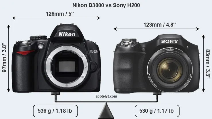 The physical size and weight of the Nikon D3000 and the Sony H200 are illustrated in the side-by-side display below. The two cameras are presented according to their relative size. Three successive views from the front, the top, and the rear are shown. All width, height and depth measures are rounded to the nearest millimeter.